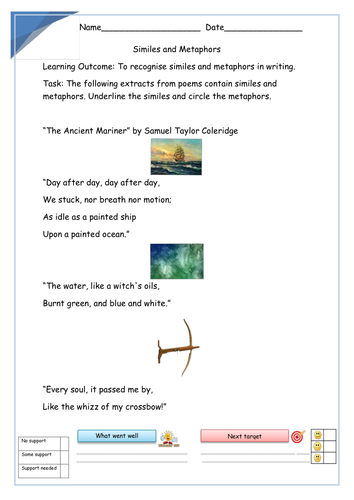Metaphors and similes are similar, yet different. Let's change the world together. In these worksheets, students are given sentences with metaphors and will have to explain what each metaphor really means. This printable includes a modeling/guided practice activity and an independent practice activity students can use to practice. These worksheets are to help students understand metaphors and practise using them.