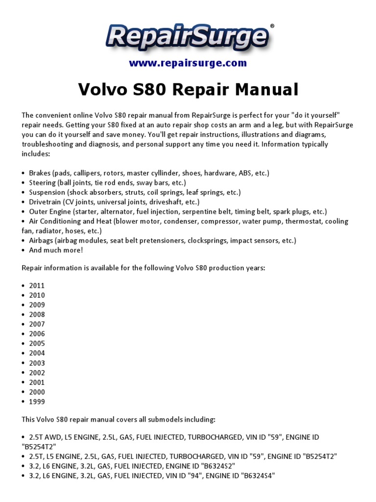 On this page you can free download workshop repair manuals pdf for volvo trucks, and also fault codes pdf and wiring diagrams. Online volvo s80 t6 repair manual. 1999 s80 t6 engine stalling rough idle power loss. Fuse box diagram (location and assignment of electrical fuses and relays) for volvo s80 (2007, 2008, 2009, 2010). 2004 volvo s80 engine mounting.